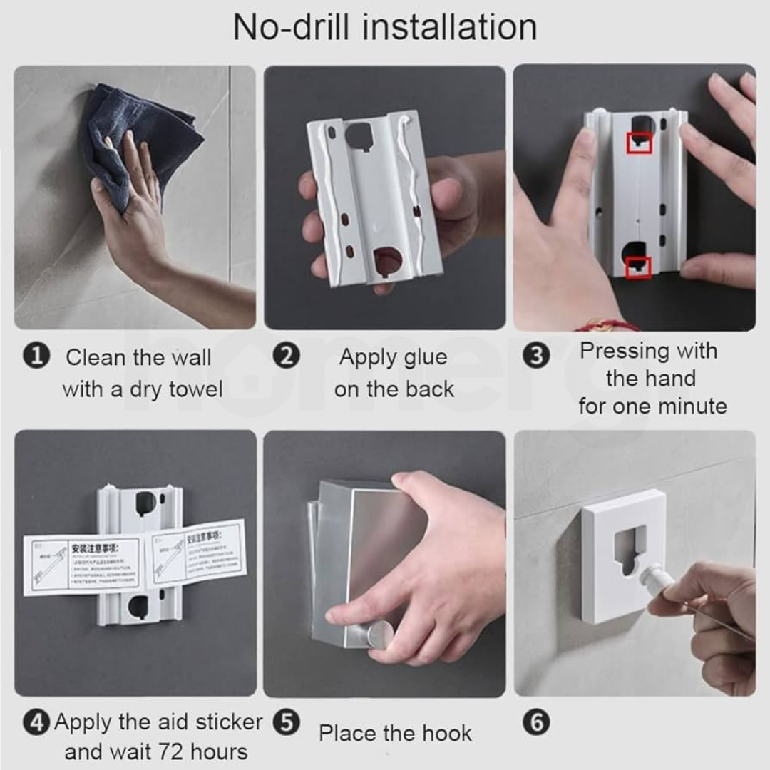 Two mounting methods are available, drilling and glue. The drilling method is suitable for all walls, glue is only suitable for smooth walls, such as ceramic tile, metal, glass, marble, etc.